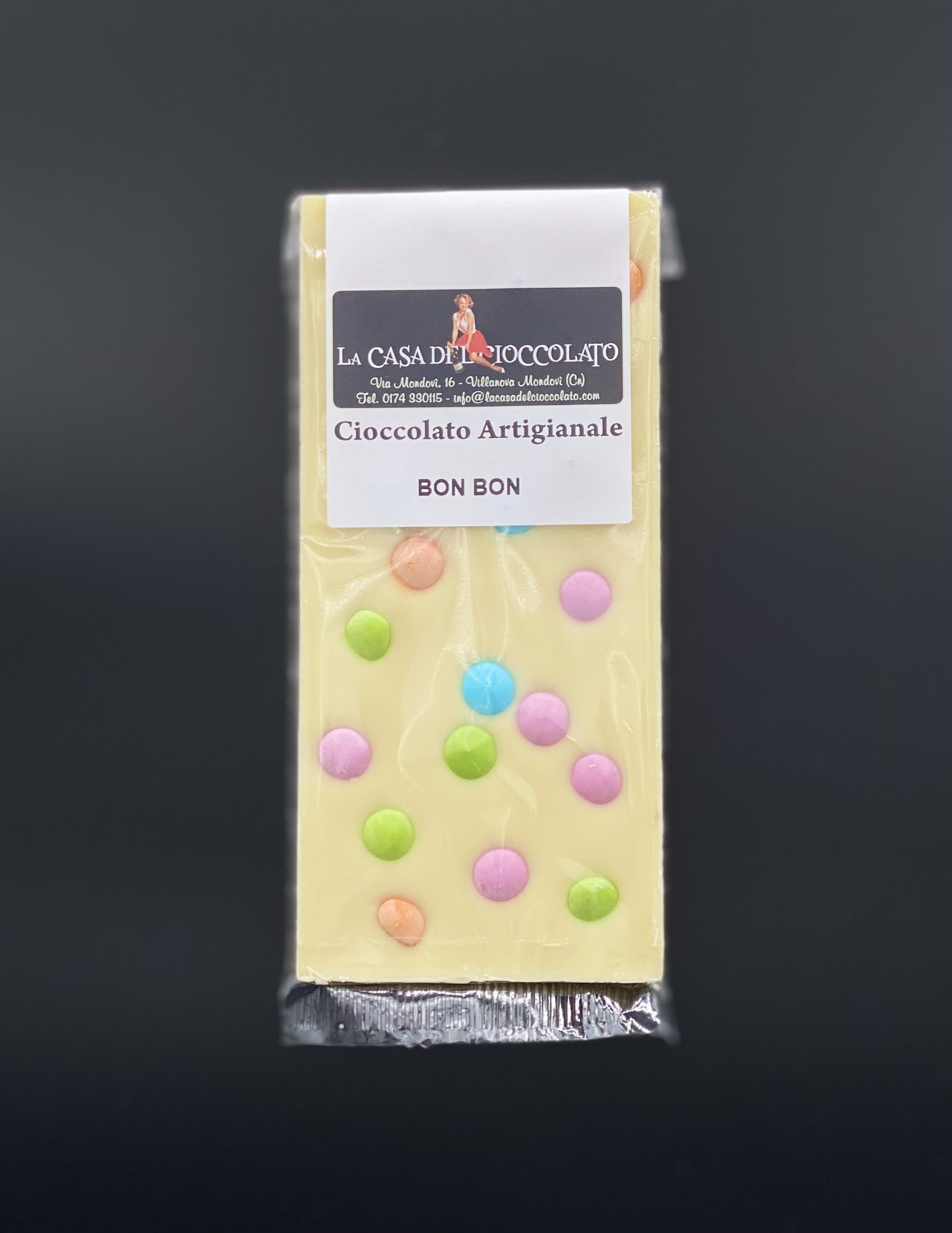 Cioccolato bianco dalla consistenza morbida e vellutata con aggiunta di bon bon colorati, che si scioglie in bocca e regala attimi di dolce piacere.