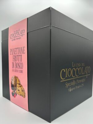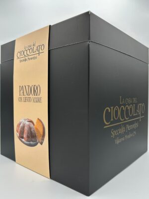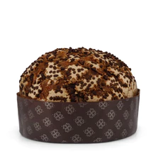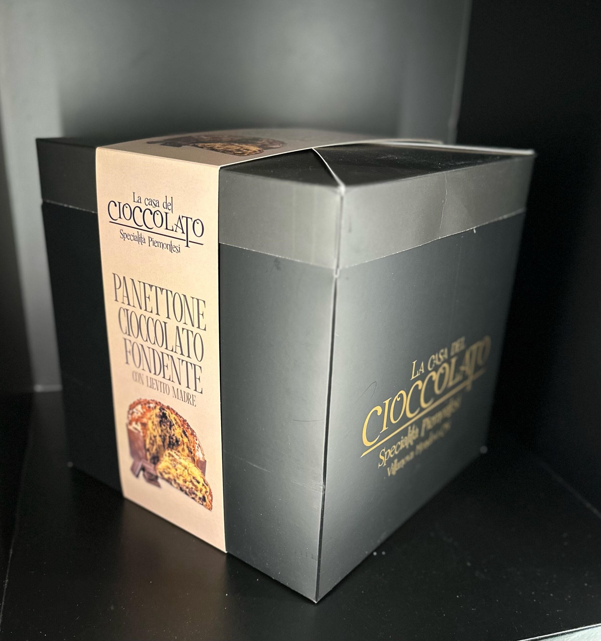 Dolce panettone al cioccolato per i più golosi, interamente farcito di piccole gocce di cioccolato fondente di ottima qualità, prodotto con lievito madre.